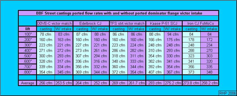 In our continuing effort to provide the most accurate information possible we will be updating the flow curves for our ported and as cast castings in the street head family of castings The street castings' flow numbers on this page are somewhat optimistic and will be revised as time allows. This is being done to allow more direct comparisons between my bench and the super flow models used by other shops. I want to strees that the HP potential of a given casting remains as it has always been. It is just the raw numbers that will be updated and refined. An example would be: Max D0VEs 355 CFM A-429's 360 CFM BT's 380 CFM RPMs 360 CFM TFS street 360 CFM Kaase SCJ's 400 CFM Dated Feb. the 4th 2005 |