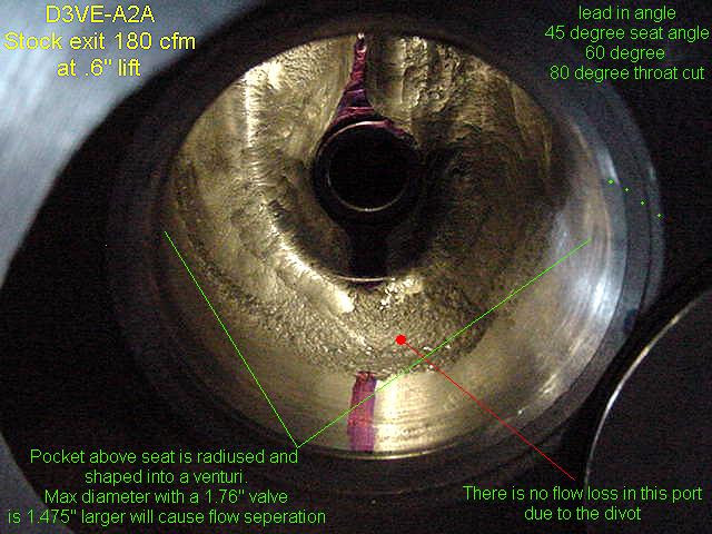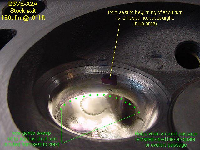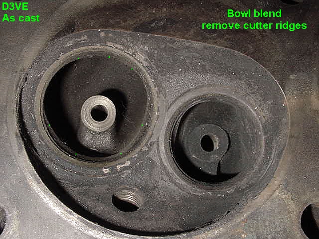 | The distance from seat to short turn is greater in the D3 castings vs. the D0VE's and prior. This straight area before the short turn rolls is important. DO NOT begin to roll the short turn right off the seat Allow the first quarter inch or so to be the venturi. Remember what the venturi in a carburetor looks like? Same thing here. The area below the blue mark is the smaller diameter of this venturi and the area below that is the beginning of the short turn roll. The area above the blue mark is the the throat cut with the three angle seat above that. |