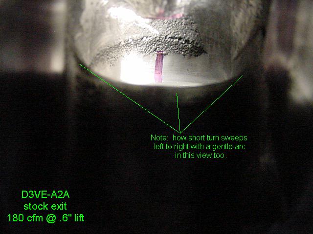 | The shape of the short turn is the single most critical area for good flow. You can mitigate alot of the damage done by the steep drop off after the crest if you shape as these pictures show. In a properly shaped port filling the floor will net you 5 or 7 cfm at .6" lift. On an as cast port, filling the floor will net you 15 cfm. You can shape the crest dropping from right to left but be very careful not to lower the crest height more than .050" in the process or you WILL hurt flow in this style of port. |