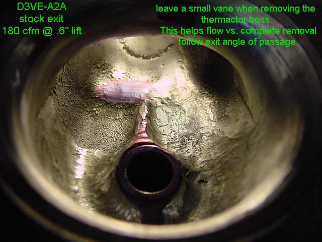 | The vane should be small and fall in line with an angle starting at the back of the pocket. As the vane nears the exit it should continue to fall toward the exit commensurate with the angle of the right side roof. It is about .2" higher than the right side roof. Removing the vane completely in this style port will hurt flow. |
