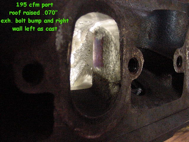 | Stock exit size port. 195 cfm @ .7" lift Excellent mid lift flow and no filling of floor This port would be great for a hot street combo. With a good 3 angle seat 200 cfm is realistic. Further bench work has shown that 200 to 210 cfm at .600" lift is very possible with proper short turn shape and a 1.76" exhaust valve. 12-23-02 SMJ/RHP |