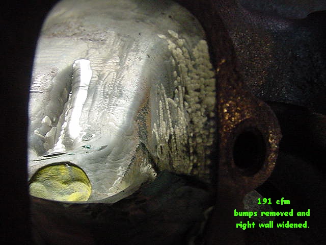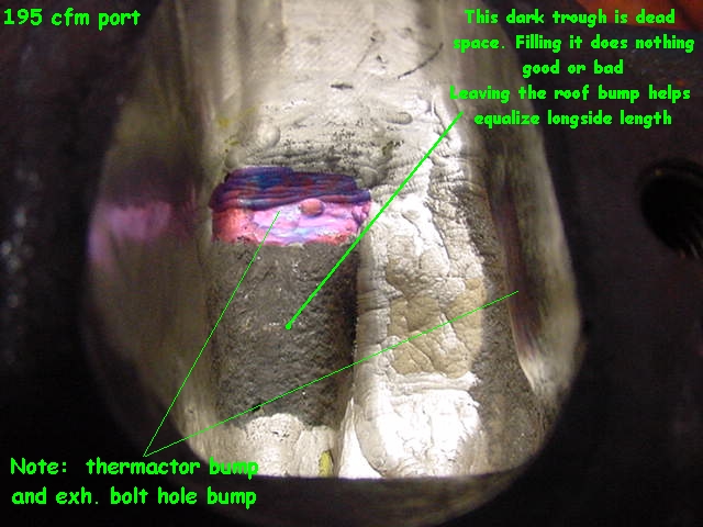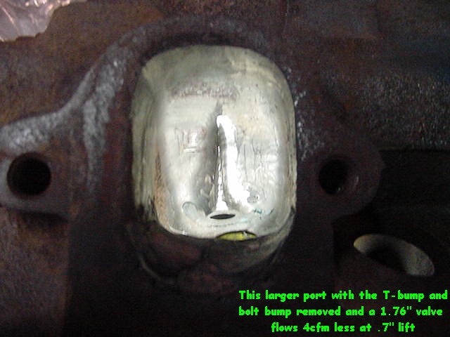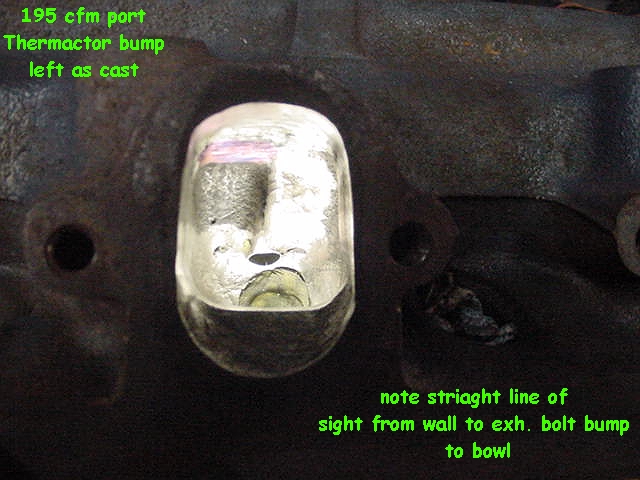 | Three ports were done in this style. In every port removal of the thermactor roof bump and the exhaust bolt bump hurt flow. Widening right wall and raising roof bring back flow but increase width and height by .1" to .125". Bigger port = lower velocity. |